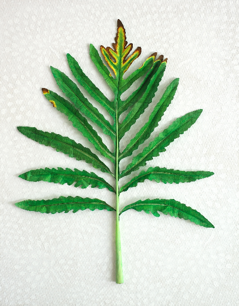In Annapolis, McCrocklin purchased junk Dacron boat sails, a durable polyster material, for around $1 a pound. She cuts ferns out of the Dacron, sews them, and inserts copper wire to support the stalks and leaflets. Color is added through acrylic paint or pencils. Spores are made of anything from mustard seeds to beads of glass. The fuzzy parts of the ferns' stems crafted from shredded canvas fiber or sometimes cotton. "I try whatever works."
