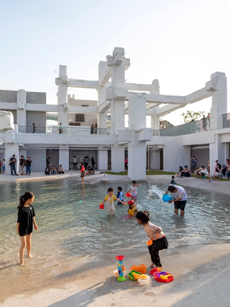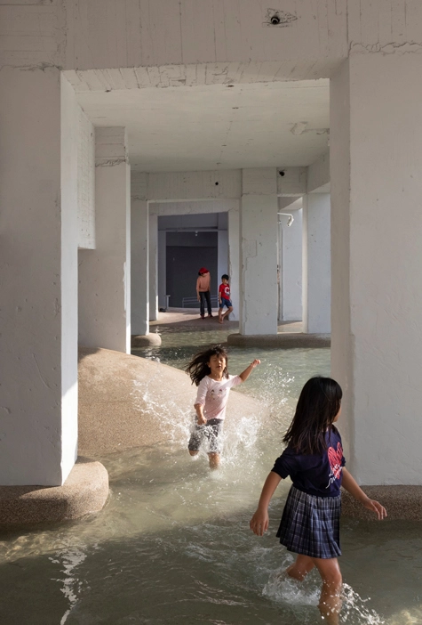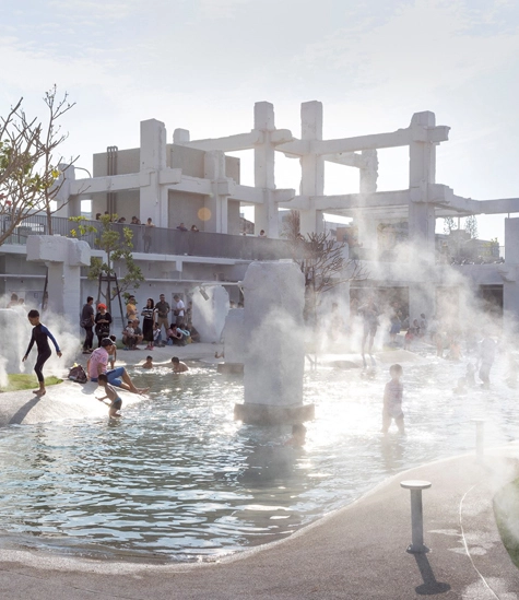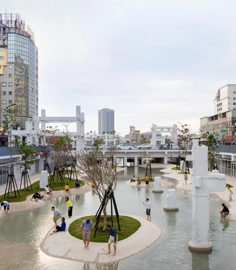 In Tainan, a city of 1.8 million on the southwest coast of Taiwan, a defunct shopping mall has been transformed into Tainan Spring, an urban lagoon park. This ingenious new public space, which reuses remnants of the mall's concrete parking garage, is at the heart of an ambitious effort to bring people and nature back to the waterfront of Taiwan's oldest city. Commissioned by the urban development bureau of the Tainan city government, the new 581,000 square foot (54,000 square meter) landscape forms a green axis with a kilometer-long stretch of Haian Road that has been redesigned for pedestrians.