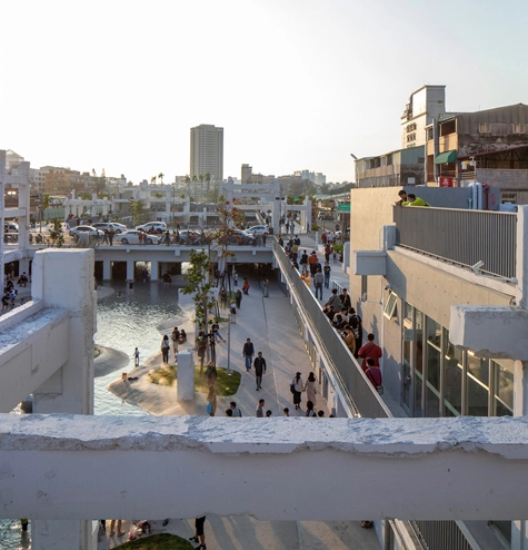 Concrete structures have been mostly integrated with a new pedestrian promenade that loops the park. Below the promenade, nooks have formed that will soon host small shops and restaurants.