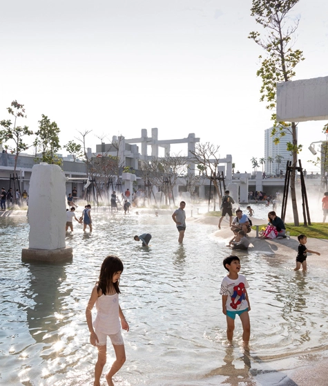 Remnants structures provide watery play spaces and shade. One part of the park contains a glass floor that offers a glimpse deep into the old infrastructural layers below.