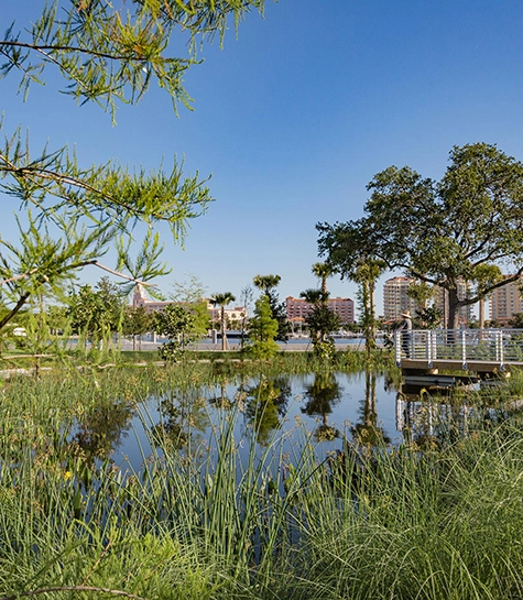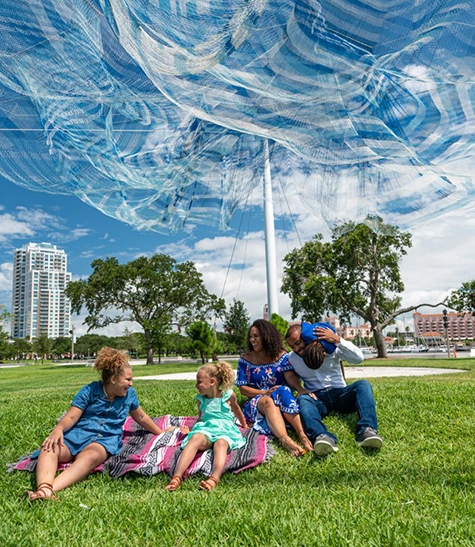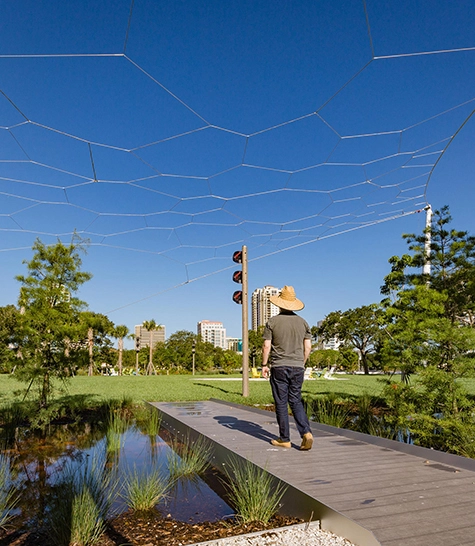 Along 2nd Avenue in St. Petersburg, Florida, an old pier launch built on landfill didn't offer much beyond lots of parking and a long hot walk 3,000 feet out to a restaurant jutting into Tampa Bay. After a $92 million redesign, a new 26-acre walkable pier district now unites city and pier through a walkable green landscape that features Bending Arc, a sculpture with a social justice message by net artist Janet Echelman, gardens, a playground, and hundreds of newly-planted native Floridian trees.