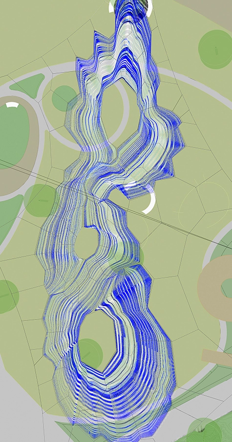 On the ground, Wilks worked with Echelman to fine tune the position of the artwork so it avoided existing trees. Wilks then created circular landscape forms below Bending Arc's three apertures where visitors can look up.