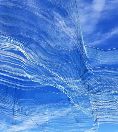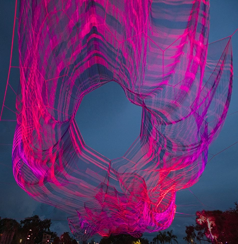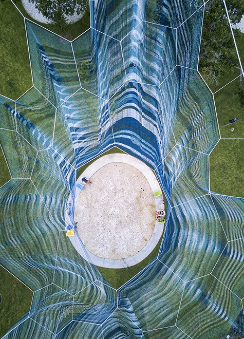 Echelman's works are crafted for their specific locations and shaped by their surroundings. Raised in the Tampa Bay area, she was inspired by the colonies of barnacles that grow on the underside of piers and the blue and white parasols that can be found on St. Pete's beaches. Her studio writes: "The sculpture’s design in aerial view can also be read as three barnacle-like parasols nestled together."