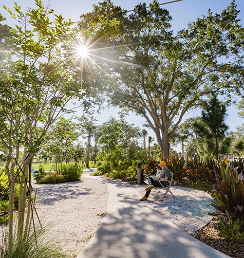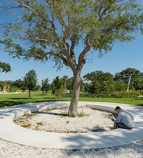 Wilks purposefully designed the perimeter of the space with native oaks and pine trees to focus attention on Bending Arc. Diagonal pathways from the gardens direct visitors to the artwork. At some surrounding edges, bioswales with native plants, which are green infrastructure systems for managing stormwater, can be crossed by low wooden bridges.
