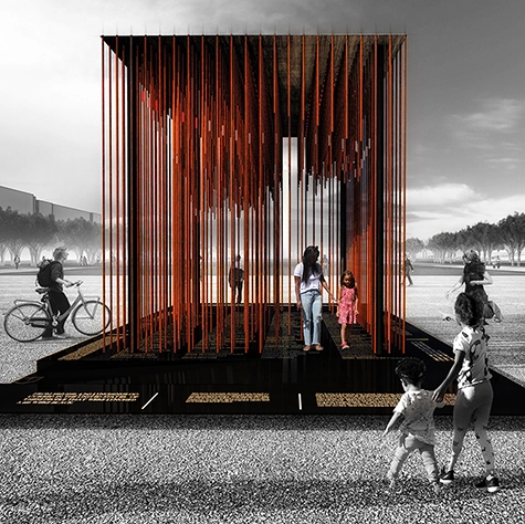 The memorial’s perfect cube form symbolizes the aspiration of our American values. However, the internal volume of the cube is constructed of uneven conduit pipes that protrude from the ceiling and floor, symbolizing the uncomfortable and fractured reality that many Blacks in society are greeted with on a daily basis.
