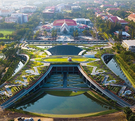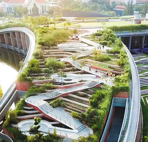 According to Voraakhom, the initial design for the new campus building was just a building. But she convinced the architecture and engineering teams to collaborate with her on a new concept. Given a large park was being developed in front of the building, why not just continue up over the building and link the rooftop green space with the park on the ground? "In the end, the design team and the clients all agreed this option will have a bigger impact," she said.