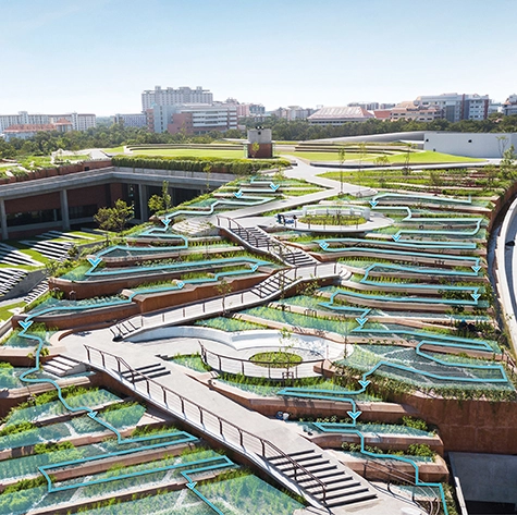 Landprocess explains: "As rainwater zigzags down the slopes, each level harvests runoff from the previous cell, forming unique clusters of micro-watersheds along the terrace to help absorb, filter, and purify rainwater while growing food for the campus."