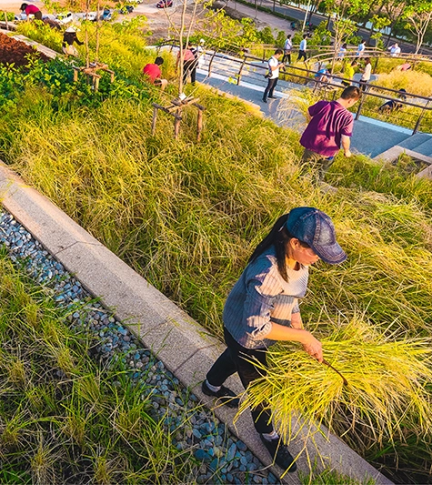 To address the problem of the lack of local access to healthy organic foods, the design team created a productive rooftop landscape. To soak up all that free water, Voraakhom's firm introduced nearly 50 kinds of edible species, including rice, indigenous vegetables and herbs, and fruit trees.