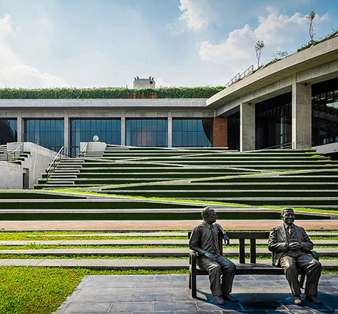 And back on the ground, at the entrance, there is another accessible, terraced amphitheater for events, with life-sized sculptures of the two founders of the university.