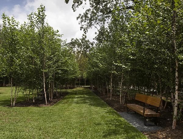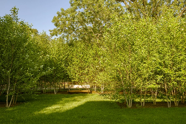 NBW planted some 300 river birch (Betula nigra ‘Heritage’) trees in rows along the edges of the landscaped rooms to the west and south of the Chapel, which are used for yoga, the annual summer solstice labyrinth, and other musical events.