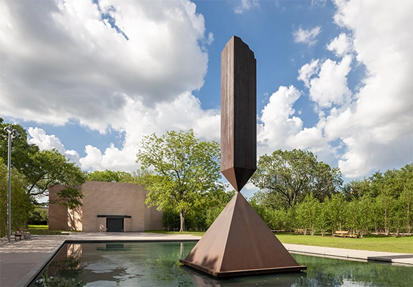 The landscape has been clarified and improved by Nelson Byrd Woltz | Landscape Architects. The firm writes that the existing landscape is structured along a primary axis, which is defined by three elements: "the irregular octagonal brick Chapel, a reflecting pool, and Barnett Newman’s Broken Obelisk that is sited at the far end of the pool from the Chapel." These elements represent art, spirituality, and justice, respectively -- justice because Barnett Newman's piece is dedicated to Martin Luther King, Jr.