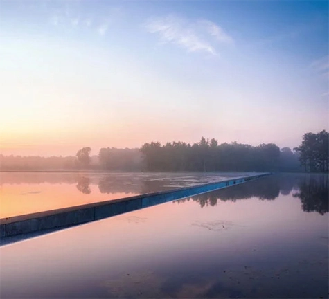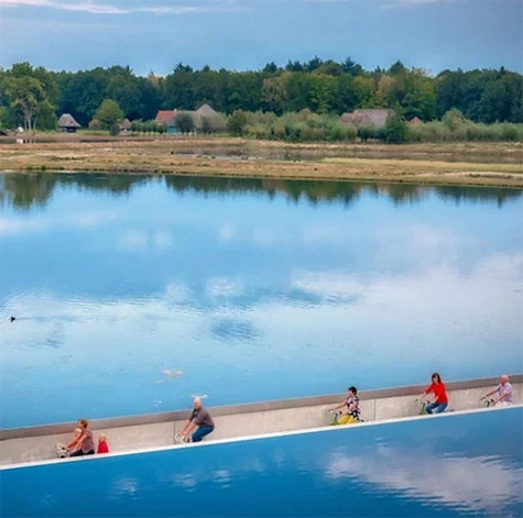 The concrete-lined path is 695 feet (212 meters) long and nearly 10 feet (3 meters) wide, and its top is designed to be level with the surrounding lake, creating an infinity effect from the distance. Burolandschap states that since the path opened in 2018, more than 300,000 cyclists have used it.
