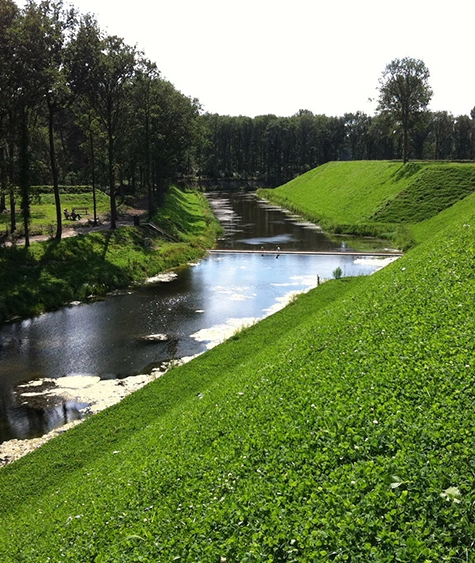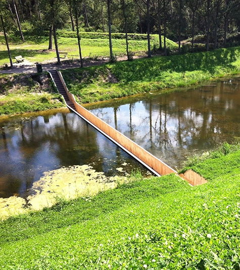 To help pedestrians reach Fort de Roovere, a recently restored fortress, RO&AD Architecten designed a low-impact "invisible bridge" made of wood and waterproofed with EPMD foil.