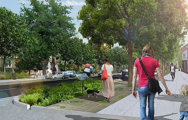 One of the greatest benefits of using green infrastructure is that it can be implemented across a wide range of scale and community contexts. Resilient coastlines/riverfronts, regional parks, and interconnected green transportation corridors can be realized at the large citywide-scale; while rain gardens, pervious paving, and a robust use of street trees can grace nearly any neighborhood-scale space.