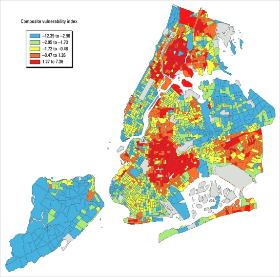 Heat risk levels vary by neighborhood. Through the Heat Vulnerability Index, which was created in partnership with Columbia University, the city government now understands that 3.4 million NYC residents are highly vulnerable (see image at top). "Risk is based in environmental factors, such as the amount of green space but also tied to poverty and race," Lundi explained. Her department has identified low-income and older Black residents as at the greatest risk of falling ill or dying from extreme heat.