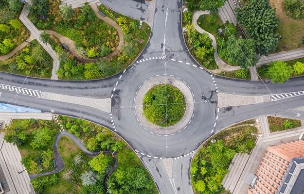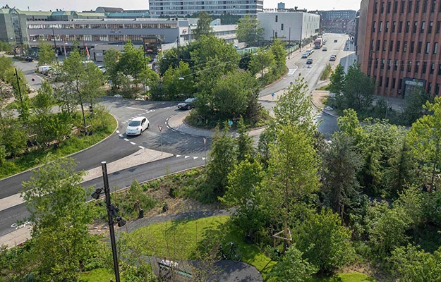 A standard roundabout in a neighborhood with very little nature was transformed into a forested area, but one that "traffic engineers can also love," given SLA integrated bike lanes and tram lines.