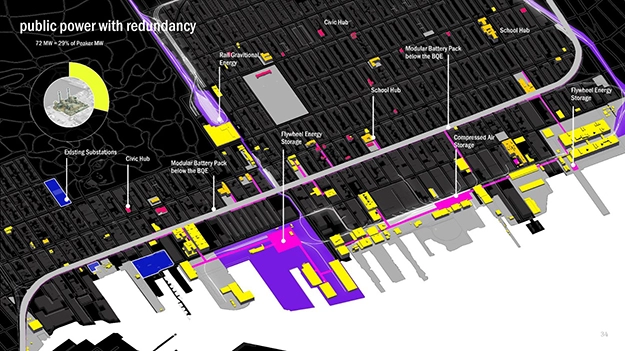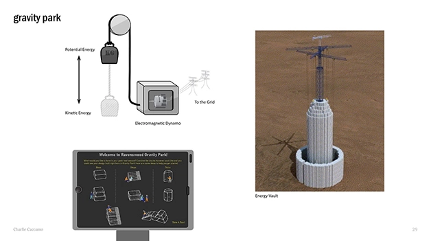 "There is a role for landscape architects here that needs to be seized. We can get ahead of the policy and innovate from how energy is perceived, stored, and used." She analyzed and discovered 75 megawatts of energy could be generated on public rooftops in the community. "Back-up storage sources could then be spread across the public sphere." Johnson and her students at CUNY have been imagining other new solutions that involve wind turbines, micro-grids, utility-scale batteries, a "gravity park" in which heavy blocks are raised to create kinetic energy that can be stored, and other systems that can both generate and store energy and serve as cleaner, more just forms of peakers.
