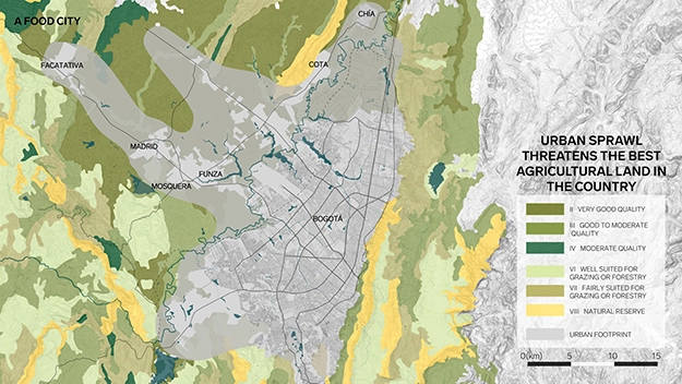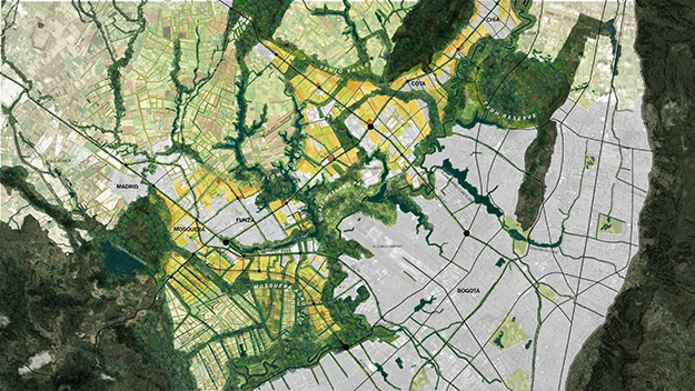 To protect the savanna landscape, which grows 40 percent of the city's food, Bermúdez proposes a strategy that first protects the historic canals, which are also hubs for biodiversity, including 200 species of birds. "Water management can be a tool for reimagining the future." As he spent a year traveling to these agricultural communities and also meeting the developers who are urbanizing the area, he found "new hope," because "people want to protect the water management system for flooding, biodiversity, and recreation." Bermúdez has been working to connect the disparate players and layers of plans into a regional plan that can guide development away from the savanna, create protective zones for the historic agricultural landscapes, and further densify the core of Bogotá.