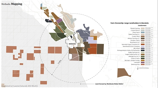 For example, Hirsch and her team of USC landscape architecture students found that "big farms get the best and most groundwater." These industrial farms can dig up to 250 feet deep to get at remnant pockets of groundwater. This process is increasingly leaving black and brown communities, many of which are immigrants, without access to water. Furthermore, old dry wells are contaminated with animal waste and arsenic, which then poisons other water sources used by immigrant workers. Hirsch studied local organizations and interviewed farmers advocating for more equitable and sustainable water management as part of eco-agricultural cooperatives.