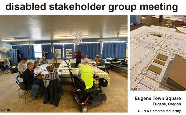 Recounting the long fight to achieve ADA requirements for buildings and landscapes, Vaughn-Brainard argued that they are really the bare minimum. Explaining her Deafscape design guidelines, she outlined how deaf people need 10-to-12-foot-wide sidewalks so they can walk and sign; a "degree of enclosure" to feel safe so recommended tall-back seating; and broader lines of sight. She called for the use of universal design principles as a "creative tool," because there are no "one size fits all" solutions. Vaughn-Brainard outlined approaches for designing with disabled communities and especially disabled designers -- from accessible meetings and focus groups, to accessible plans and models for teams of abled and disabled to review together, to accessibility audits landscape architects can undertake with communities.