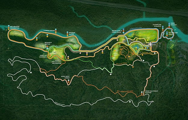 Trails throughout the arboretum and nature center will be made ADA accessible, and a new "Braille trail" for blind and low vision users is being considered. SCAPE proposes a series of learning stations along shorter loops organized around themes such as geology, hydrology, and the role of this landscape in the Civil War.