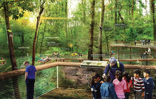 Elevated canopy walks now exist in the arboretum but will be extended into the restored wetlands and redesigned to offer greater flexibility, a lighter footprint, and a higher elevation to accommodate for climate change. "The new canopy walks will be more resilient and offer a different experience," Voron contends.