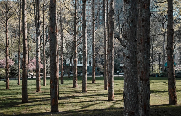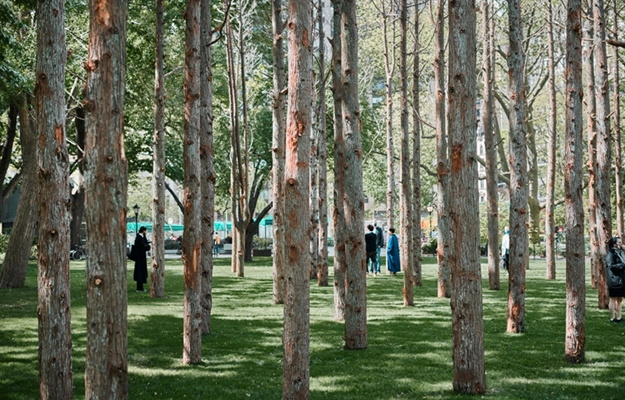 In Manhattan, across the street from the Flatiron building in Madison Square Park, public artist, landscape designer, and architect Maya Lin has created the stark and beautiful memorial Ghost Forest, a set of 49 cut Atlantic white cedar trees that will slowly turn grayer over the course of six months. According to the Madison Square Park Conservancy, which commissioned the project, it represents "a memory of germination, vegetation, and abundance, and a harsh symbol of the devastation of climate change." The trees, set in a grove within the lawn of the park, are approximately 40 feet tall and were selected to "overwhelm the human scale" and provide a bracing symbol of what the future may hold.