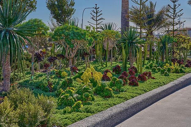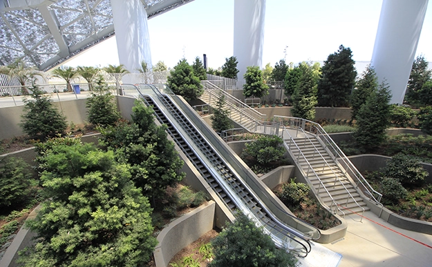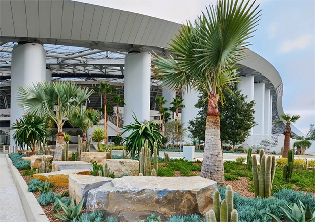 The 25 acres of open green space alone will also serve as a community draw. The public park and diverse landscape features 5,000 newly-planted native and climate-appropriate trees from Southern California and similar Mediterranean biomes, including Palm, Sycamore, and Evergreen trees. Plants that would do well in California's desert, upper and low montane, and riparian ecosystems are found in various zones of the stadium landscape and adjacent park, which includes the first segment of the planned arroyo.