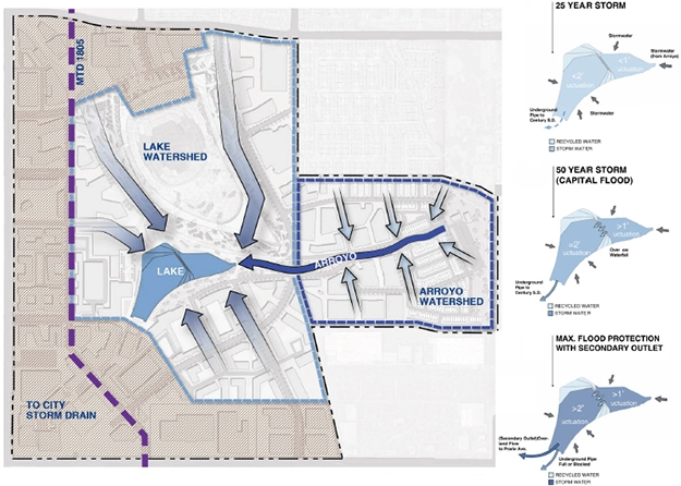 Working with the community, Studio-MLA began focusing on how to insert a lake into the site. "We wanted to bring the lake back, but it couldn't just be recreational; it needed to be performative." So Lehrer and team had an idea: a new lake could store water to irrigate a new botanical, sustainable landscape. But given how intermittent rainfall is in Southern California, they realized multiple water sources were needed for both the long, dry season, and the short, inundating ones.