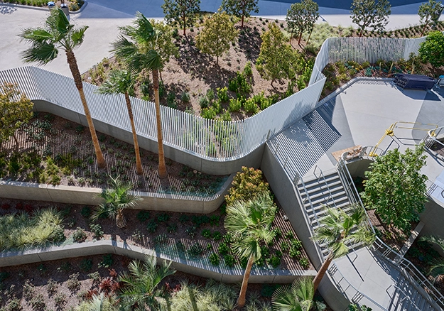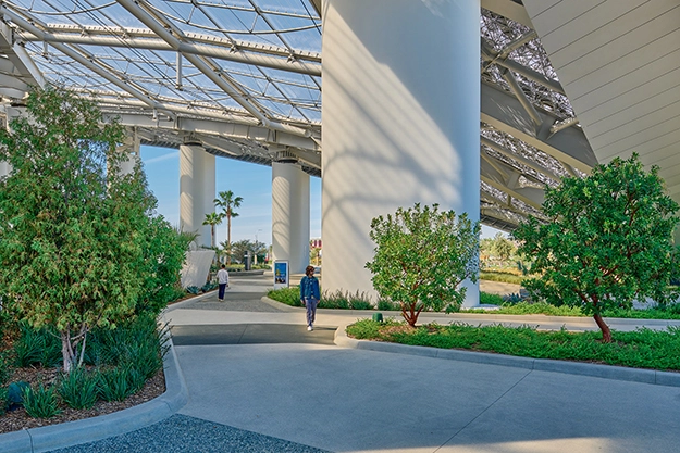 With a water source in place, there was now a way to substantially green the indoor-outdoor SoFi stadium. Landscape was key to making the experience more "human," Parekh said. Instead of feeling like "you are going down into a hole in the ground," Studio-MLA designed inviting landscape canyons that provide an entry point to the arena stands. "The canyons allow for air, light, and views of the landscape from within the stadium."