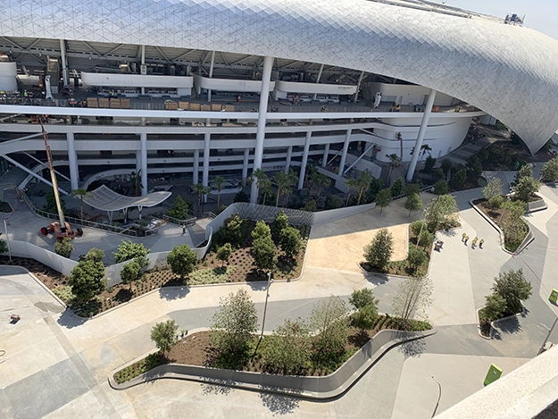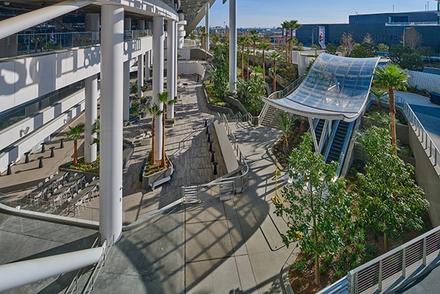 He added that the integrated architecture and landscape architecture was the result of "collaboration from the beginning" between Studio-MLA and HKS, along with PACE, Fluidity Design Consultants, civil engineer David Evans and Associates, and contractors Turner and AECOM Hunt. Studio-MLA brought prior experience designing the landscapes of Dodger and Banc of California Stadiums, also in Los Angeles, but the entire design team agreed on the need to "change the paradigm of the stadium model" by further mixing public plazas and parks with the stadium structure.