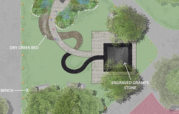 The pathway leading to this memorial stone embodies the evolution of Tamir’s life and incorporates and revitalizes the existing butterfly garden, which also becomes a creative beginning to the memorial space. The curved pathway and dry creek establish a sustainable mitigation area for stormwater runoff. As the years pass, there will be time to understand if and how this memorial heals a community and, in particular, a family that remains in pain.