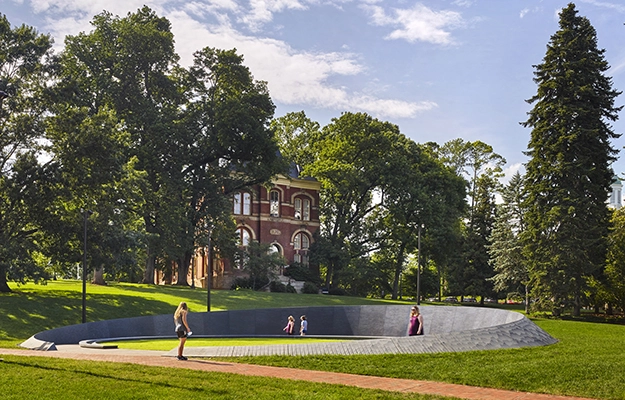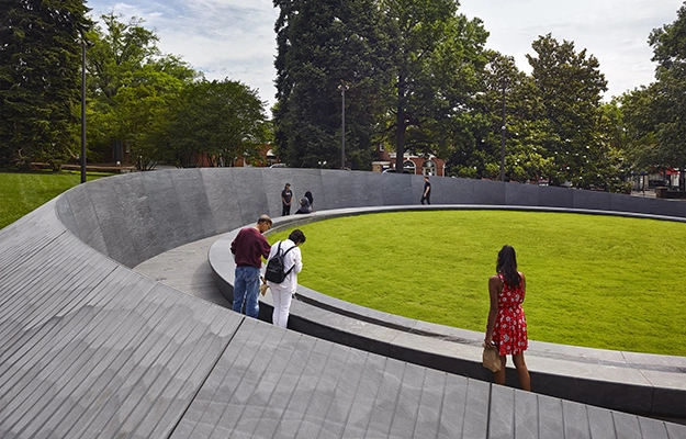 The memorial responds to the fraught history of UVA with an open form, a sweeping gesture in stone that is welcoming and inclusive as if waiting for the visitor to complete the memorial. It is a form that is open in terms of meaning, alluding to the African ”ring shout” and is space of shelter and gathering.