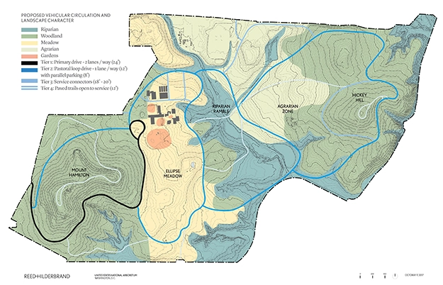 Reed Hilderbrand plans on shrinking the parking lot facing the gates and expand the central Ellipse Meadow, the centerpiece of the arboretum, to extend south. "We will remake Ellipse Road as a pedestrian path and reconfigure the drives in this part of the campus." Communities cut off from the park will soon be able to enter and greeted with an expanded meadow.