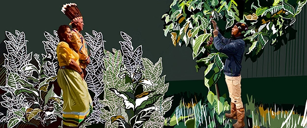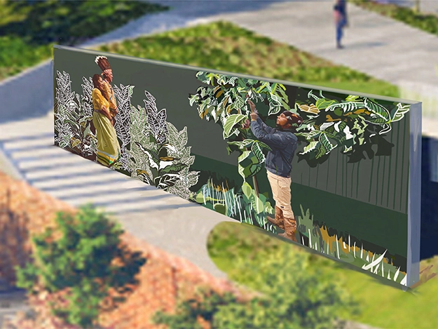 Mickey Demas and Nicole Bourgea's mural Our Land will be found at the Navy Yard entrance wall and will reflect the "heritage of those living on and caring for DC’s land," featuring members of the "native Piscataway Tribe among a field of tobacco plants, which hold historical and spiritual significance for the Tribe, and Ward 8 farmer, JJ Boone, propagating a native Paw Paw tree."