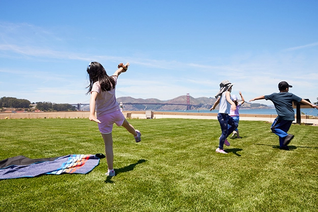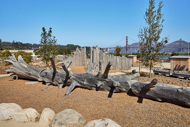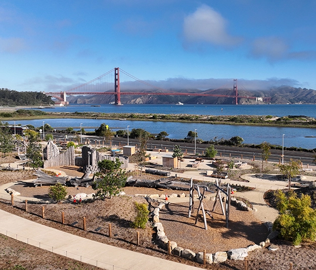 Play elements extend east from the Crissy Field Center creating an inclusive environment for toddlers to preteen children. The elements escalate in complexity as children move outwards from the buildings.