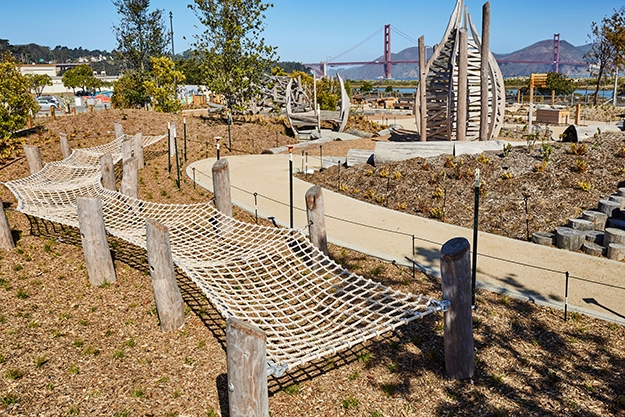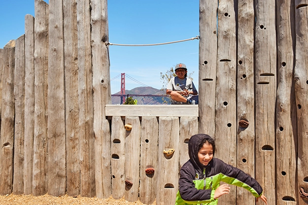 Custom play elements are designed to bring children into the vistas. For example, there is a gap in the Outpost's climbing wall on axis with Golden Gate Bridge. "Moments like this can create positive memories and life-long connections to the outdoors," Kennedy argued.