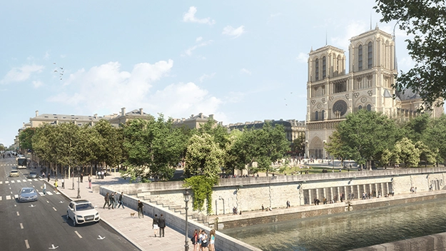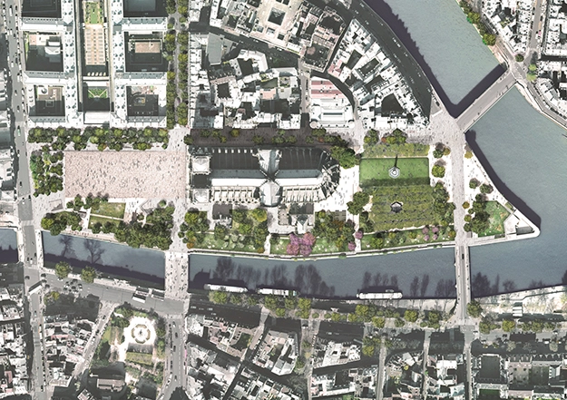 Smet's team will ring the cathedral in trees that will provide shade and cool the air, creating a micro-climate on Île de la Cité, the island in the midst of the Seine River where the cathedral is found, and its immediate surrounding area. The form of the existing rectangular square in front of the cathedral will be simplified, creating "a perfect rectangular form" to make it clearer and more usable, edged with a new canopy of trees, Smet's firm states.