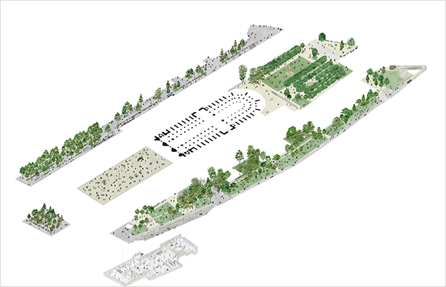 And as he noted to Wallpaper magazine, "we wanted to make a nuanced composition. You’ll walk in, sit, stay, go underground, open towards the river, emerge close to the entrance…More than giving a form, we are giving an experience."