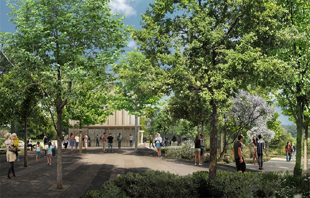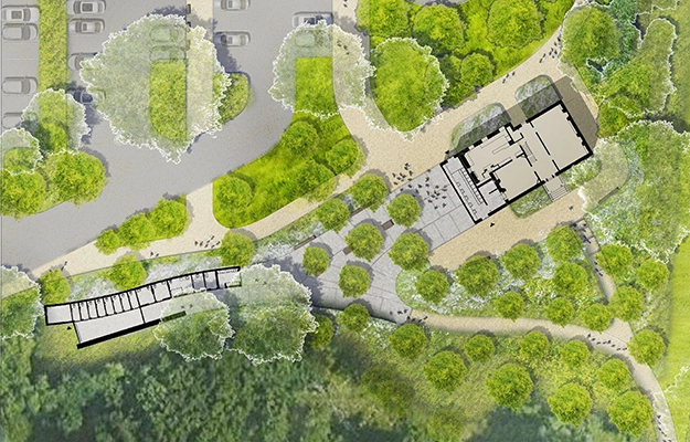 A new entry sequence will move parking lots out of the campus and into a consolidated area at a forested edge. The idea is visitors will no longer need to navigate around vehicles once they arrive at the center, and former parking lots can now be used as platforms for more outdoor sculptures.