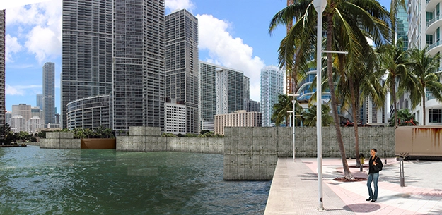 Key to this shift were renderings created by Miami-based, women-led landscape architecture firm Curtis + Rogers Design Studio for the Miami Downtown Development Authority, which governs the business district. These concepts were included in the Authority's response to the Army Corps' Back Bay Coastal Storm Risk Management Study but soon became the focus of public attention and coverage in The Miami Herald and local TV stations, social media discussion, and national coverage in NPR and The New York Times. The authority commissioned visuals that would both show how 20-feet-tall concrete walls along the bayfront would impact the city (see images at top) and demonstrate how a better alternative, rooted in nature, could offer protections while offering many other benefits.