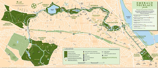 In the Boston and Brookline, the Emerald Necklace, a 1,100-acre chain of 12 parks, was originally designed by Olmsted to provide multiple benefits. It was simultaneously designed for flood control for the Muddy River, sanitation, scenic beauty, and wildlife habitat.
