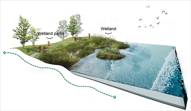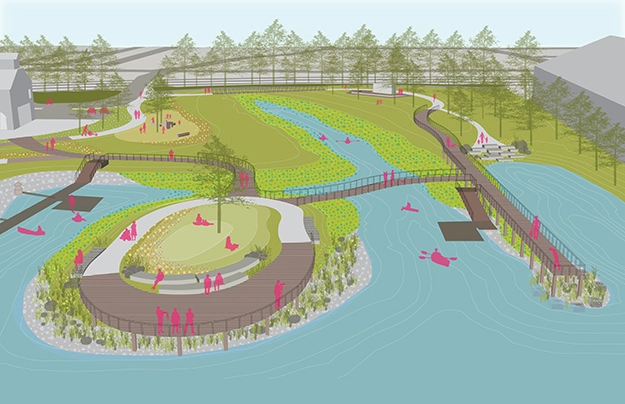 Through a community-driven approach, landscape architects at Supermass Studio and Assemblage Landscape Architecture designed nature-based climate-adaptive solutions to river rise.