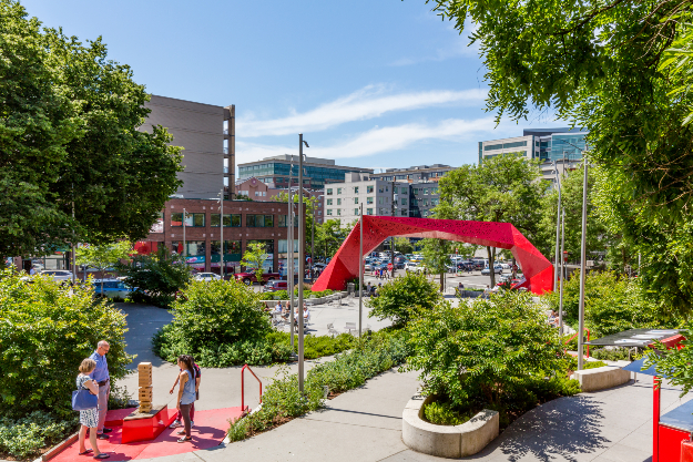 At two-thirds of an acre (.27-hectare), this small park in the Chinatown-International District Neighborhood features a bold red "metal gateway inspired by Asian paper cutting and folding traditions." Yu partnered with the Seattle-based firm MIG | SvR to design a park with "multiple garden terraces, inspired by the rice paddies of Yu’s agrarian upbringing, and numerous gathering and performance spaces," TCLF writes.