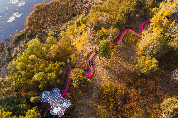 Once a make-shift garbage dump, Yu revitalized this landscape along the Tanghe River, weaving in diverse native plants and adding a "sinuous 1,640-feet-long (500-meter) red benchlike structure" that glows at night.