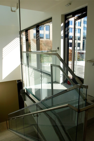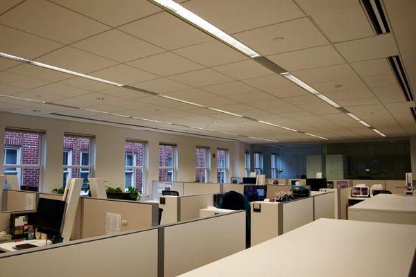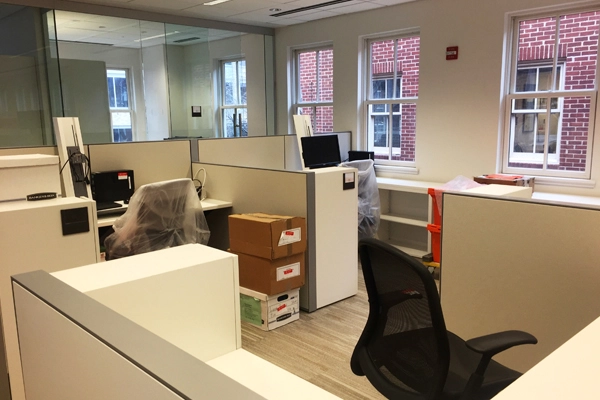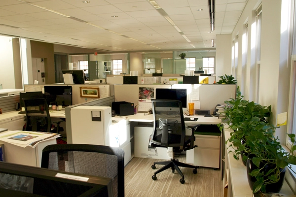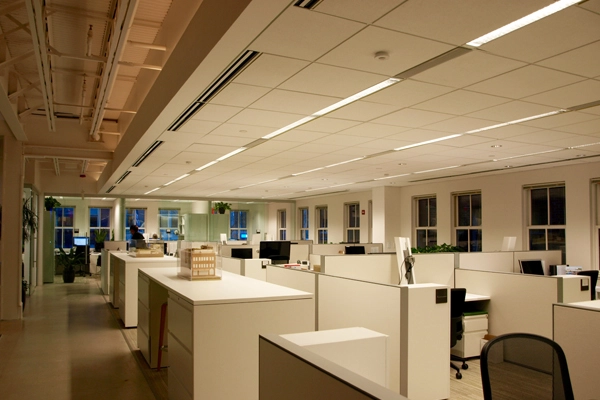 Significant structural work was needed to open up the dim, compartmentalized series of cubicles found on each floor of the building prior to the renovation. The basement-level conference space was moved up to street level, the interior staircase was completely opened up, and the closed-off workspaces are no more.
