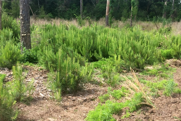 We observed several dead loblolly pine (Pinus taeda) trees within the landscape. Upon further examination, we uncovered pine saplings sprouting from the root zones of their ancestors six years after the initial conception of the space. Dog fennel (Eupatorium capillifolium) and coneflowers (Rudbeckia spp.) were noted growing within the space as well.