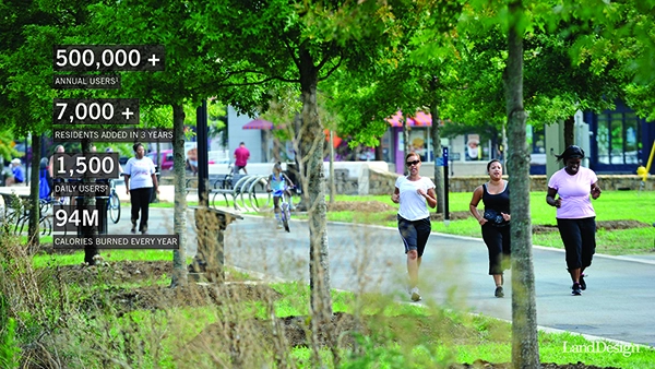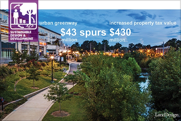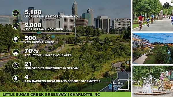 At LandDesign, we’re using metrics to elevate our design process and prove the value of our work. In undertaking the master planning of the Little Sugar Creek Greenway, LandDesign’s goal was to strike a balance between environment and community. For decades, much of the severely polluted creek was hidden beneath a concrete cap. By understanding and communicating the benefits of removing pavement and reshaping the creek’s banks, LandDesign was able to transform the creek into a community amenity. Implementation of this urban greenway has restored critical ecological systems, created a recreational destination, and brought economic revitalization to midtown Charlotte.