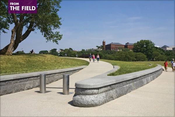 For the National Museum of African American History and Culture, Gustafson Guthrie Nichol similarly used low walls around museum for vehicular security. The goal for landscape architects is to design in such a way that can help prevent major attacks and high-casualty incidents, but continue to promote expression of ideas and great public discourse.