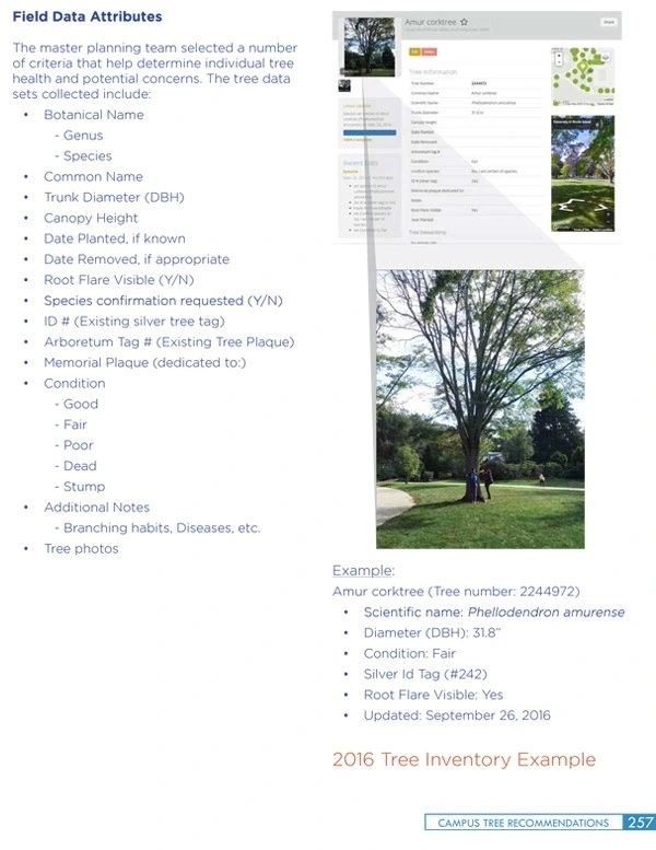 Members of the master planning team met with a class of plant sciences and landscape architecture students to collect in-field data and initiate the foundation of a digital campus tree inventory. The application utilized is known as OpenTreeMap, which is a subscription-based online application where trees can be mapped from a phone or tablet and existing data can be uploaded. The application can be customized with data fields specific to site needs, with unlimited users, user roles, and permissions. Edit history can also be tracked, future plantings can be modeled, and green infrastructure benefits tracked. The locations of campus trees to be collected was broken down into sections. Each section had a group assigned to it which was composed of a tree identification expert and several students. Participants collected tree data and photos via the use of personal smartphones.